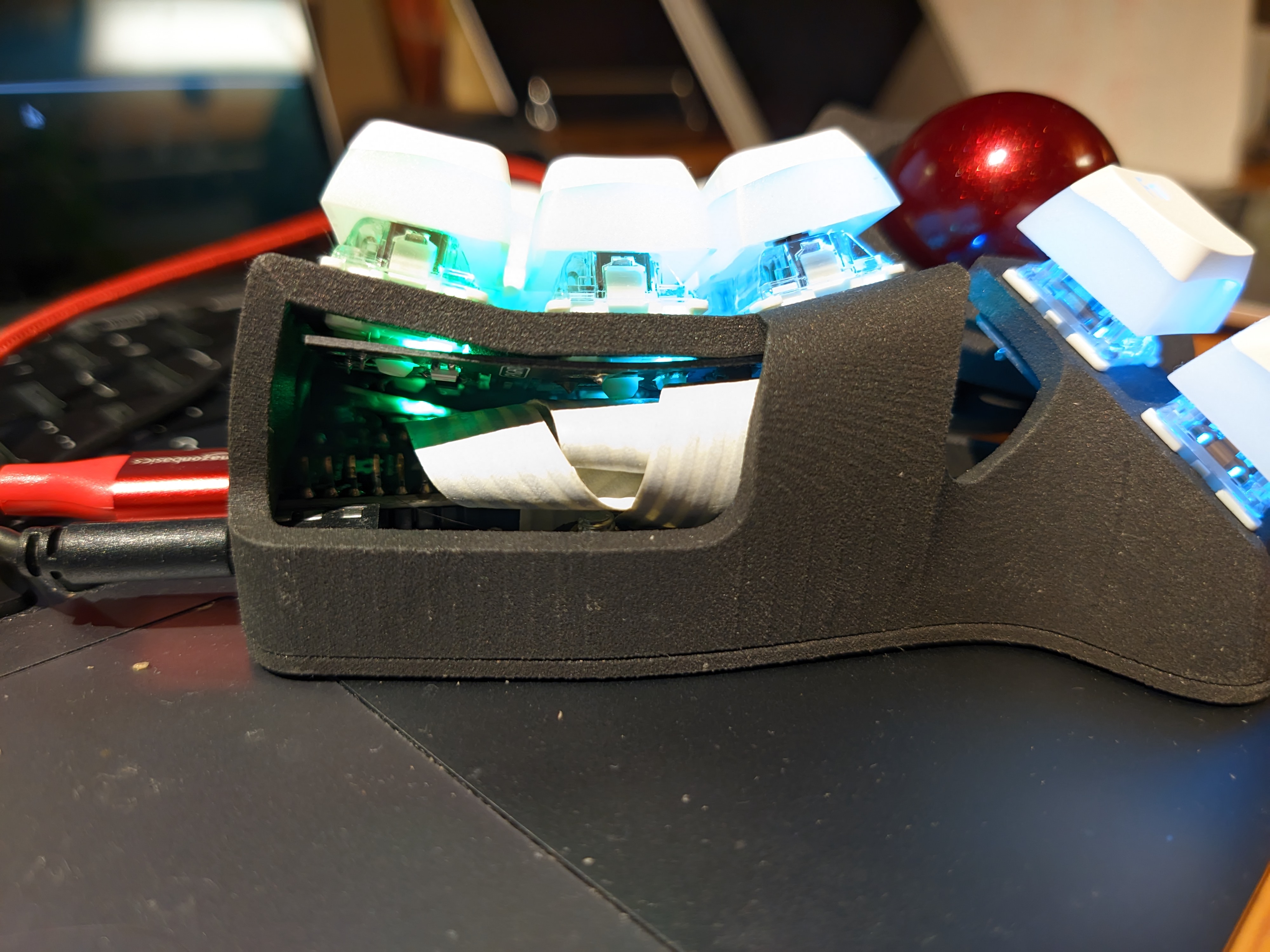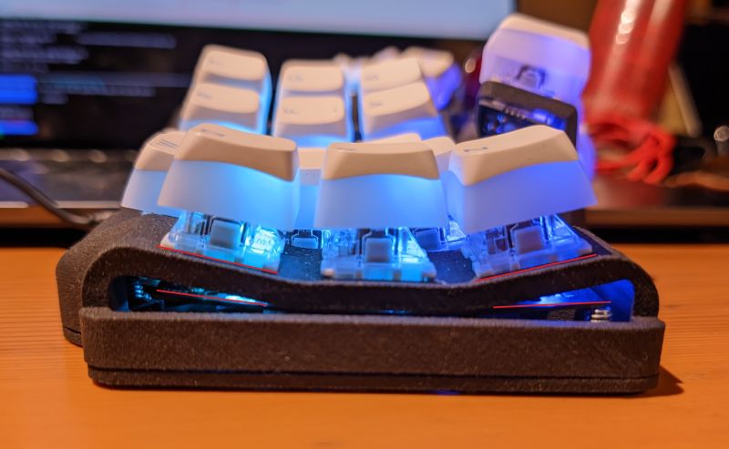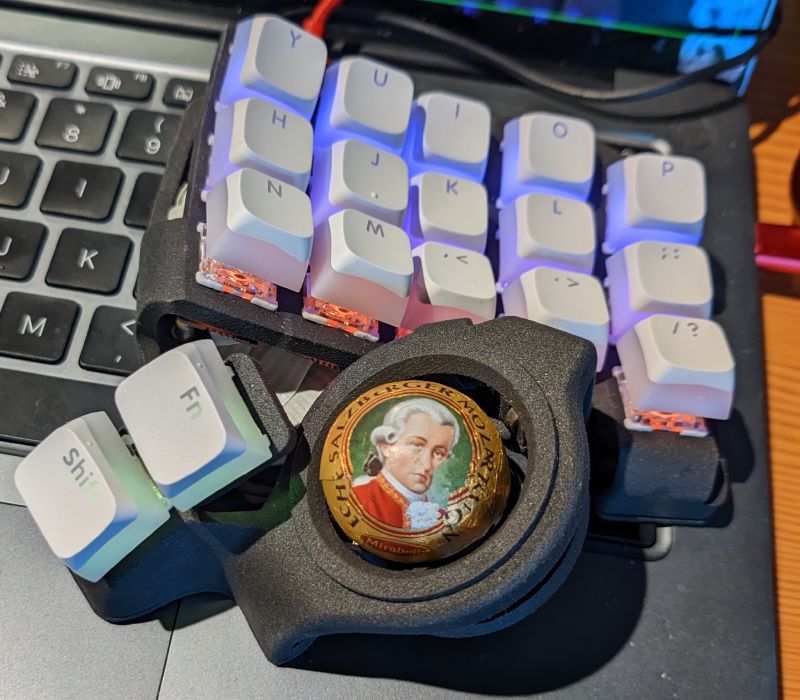 The thing runs QMK, because of course it does. Here’s my keymap/config. I haven’t the foggiest of clues about what an efficient keymap for this few keys looks like, copypaste at your own risk. The interesting bits are probably everything but the actual keymap.
