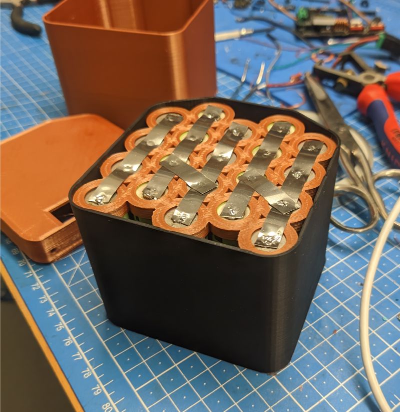 Originally, I had those Lego-like square interlocking 18650 holder things, but was unhappy how they wasted a lot of space, and had sticky-outy bits along 2 edges I’d need to cut off and/or design around.