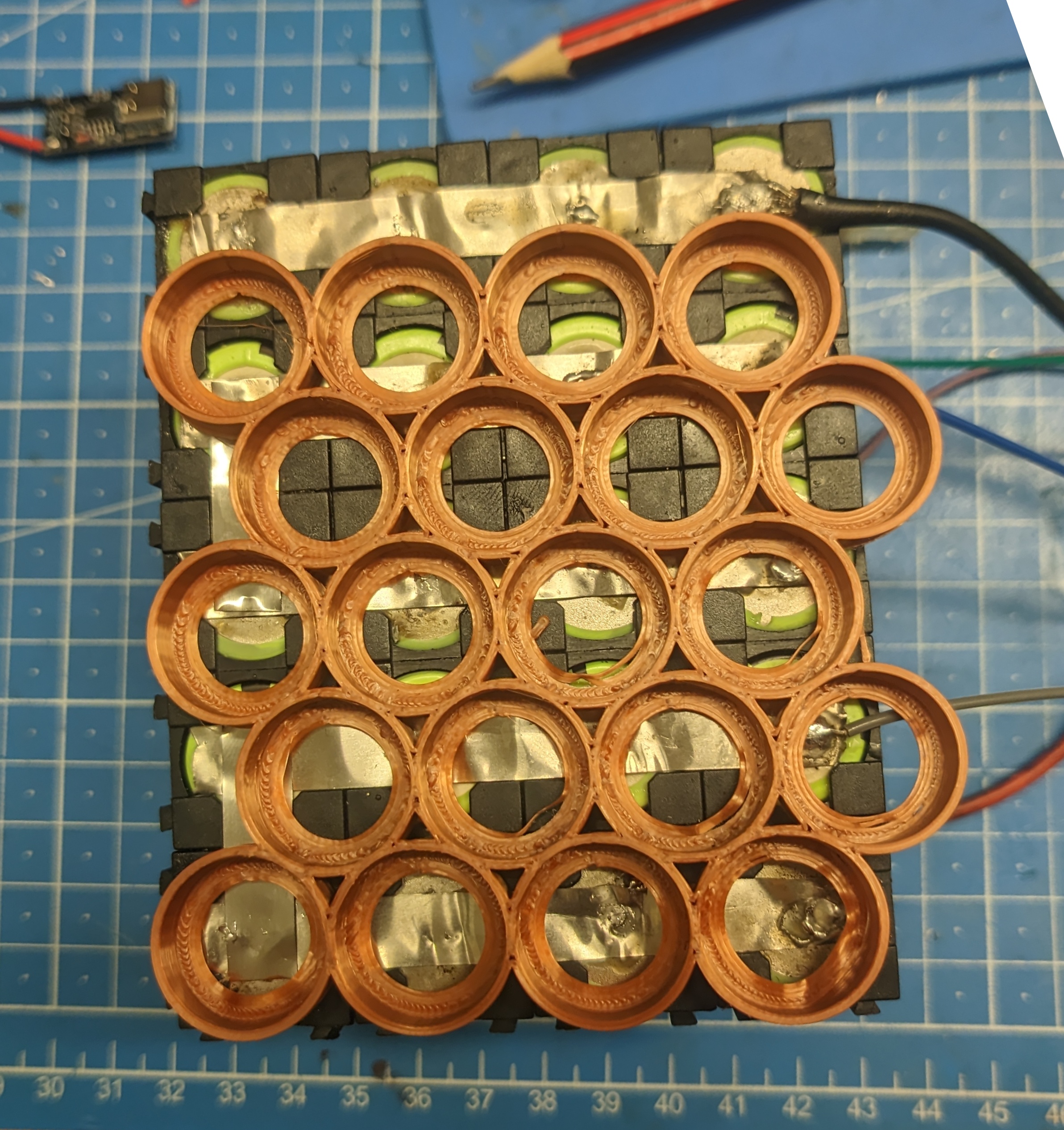 I found an 18650 holder openscad script3 online, that can do honeycomb layouts, and liked that much better.
